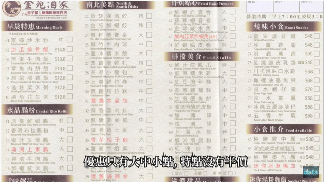 By KF Cheng on Wed, 2021-04-21 神州穿梭.香港#440] 旺角抵食酒樓 大,中,小點一律半價 旺角地鐵站上蓋 精選盅頭飯12.8元起 | 金苑酒家 Data Ma 2021-03-05 簡介 圖片 地圖 金苑酒家 地址 旺角彌敦道655號胡社生行4樓 港鐵旺角站 E1 出口, 步行約1分鐘 電話 21521108 Openrice 開飯喇 金苑酒家 Gold Garden Restaurant Image Image Image Image Image Image Image Image Image Image Image 參考 店鋪格局 茶樓、酒樓 菜式菜系 港式、粵式、普通 落餐方式 單點、點餐 客人烹煮 廚房廚師製作 食物種類 點心 旺角